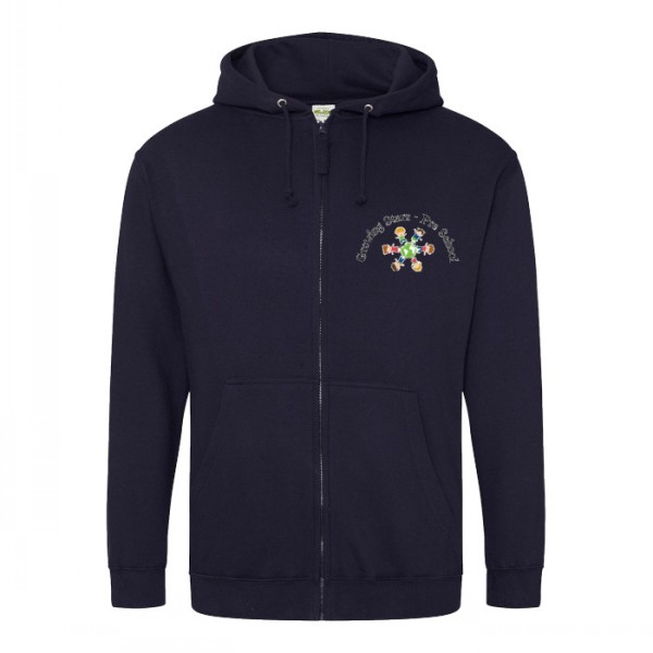 Ralawise sleeve full zip hooded sweatshirt with the Growing Stars Pre-School logo. Ribbed hem and cuffs with hand warmer pouch pockets.